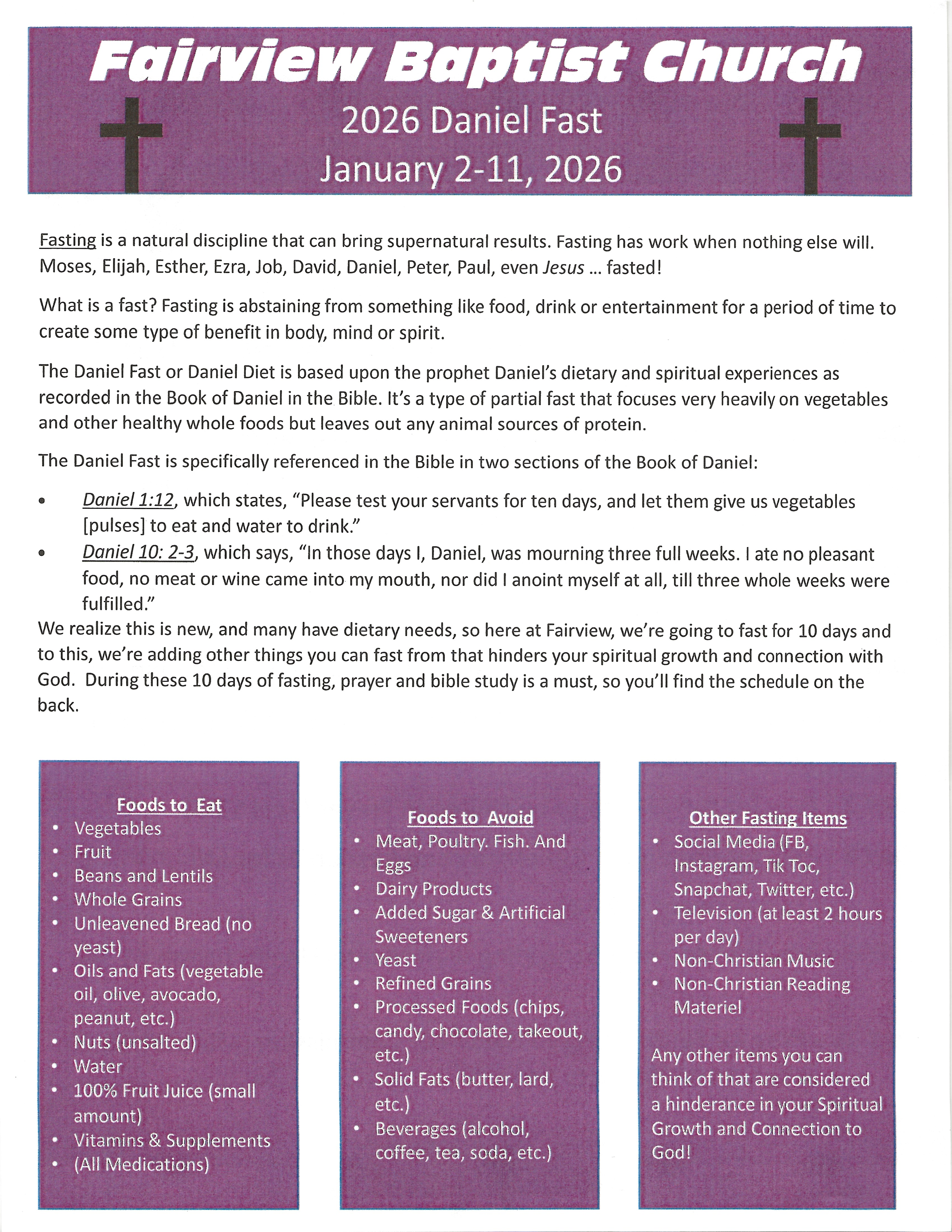 Pray for the Unity of the Church (Romans 12:18; Ephesians 4:3)January 6, 2026, (all day) CLICK BELOW to Download Full Document with Daily Devotional and Fast Suggestions The Daniel Fast - What is Fasting; Daniel's Fast; Suggested Fasts Daily Devotional Prayers for Fasting |